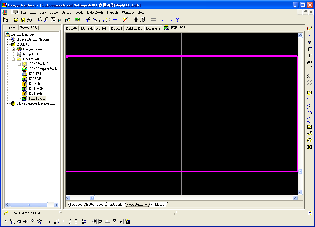 雙擊新命名之PCB檔,進入PCB布線畫面,先點選畫面下方之KeepOutLayer頁面標籤,再用畫面右側之繪圖線畫出邊框線,如圖14。畫面一樣用PageUp或PageDown調整至適合大小做繪圖。