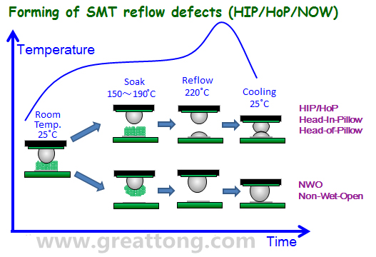 上圖將NWO(Non-Wet-Open)與HIP(Head-In-Pillow)或HoP(Head-of-Pillow)在SMT的Reflow溫度曲線下形成的原因稍微做了解釋,基本上兩者都是因為板材變形所致,只是HIP的錫膏會保留在電路板的焊墊上,但NWO則完全轉移到了錫球。